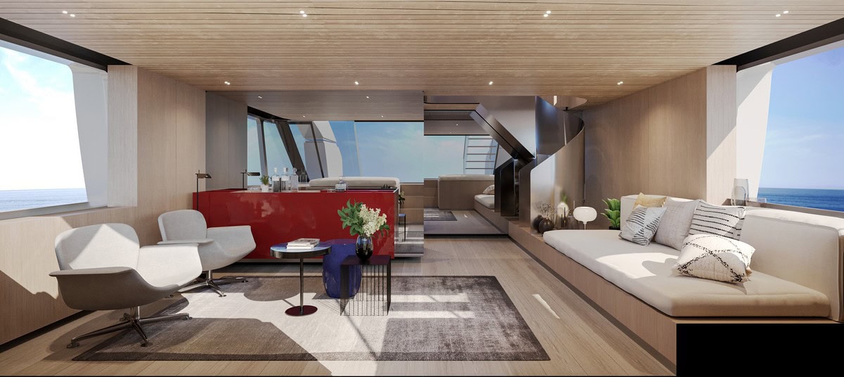 Ad esaltare il continuo scambio tra interno ed esterno le ampie vetrate a tutta altezza e l’ampio pozzetto di poppa sul ponte principale, mentre catturano l’attenzione le grandi finestrature che riparano l’upper deck dove si trova la timoneria. Completano le features principali le terrazze laterali apribili che regalano luce all’interno della lounge e connessione all’ampia beach area ed un generoso enclosed upper deck che all’occorrenza, grazie ai sistemi di apertura dell’hard top, dei vetri laterali e della porta di poppa, diventa a tutti gli effetti un vero e proprio flybridge.
