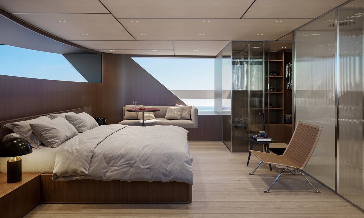 La parte di prua del main deck ospita la cabina dell’armatore, le tre cabine per gli ospiti si trovano nel lower deck, in collegamento diretto alla zona lounge.