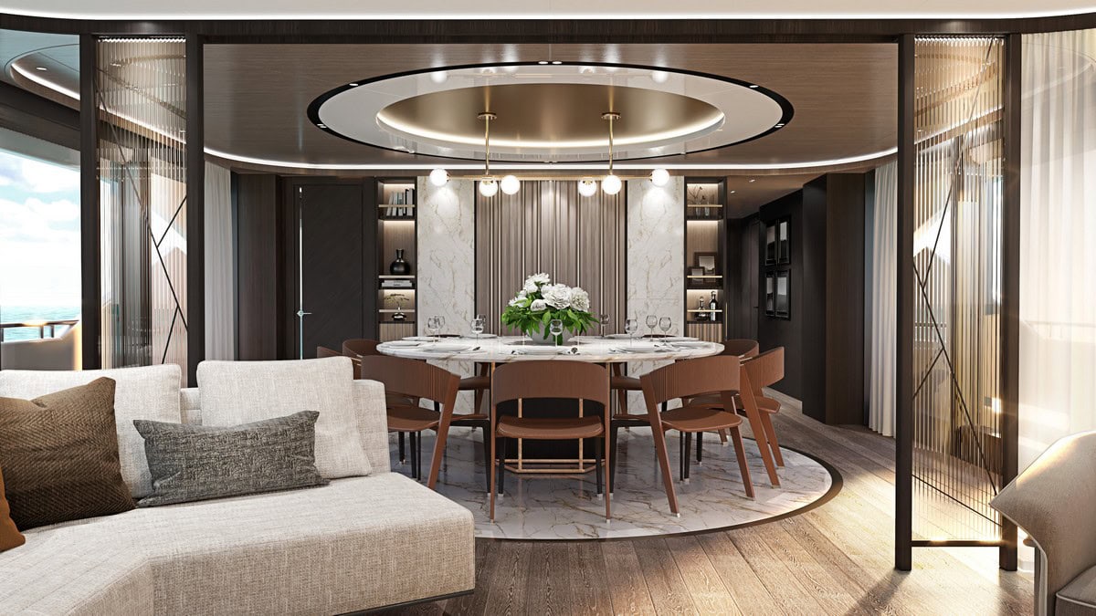 Il ponte principale, con oltre 122 metri quadrati di volume interno, è sapientemente suddiviso tra la zona pranzo formale e il salotto, senza compromettere lo spazio o la fluidità degli ambienti. Il pavimento in marmo nella sala da pranzo, vine esaltato da un disegno geometrico coordinato sul soffitto, mentre il salone beneficia di una selezione di mobili più angolari, un grande divano a babordo, con piano d’appoggio e scaffali integrati. Sul lato opposto, comode poltrone con tavolino offrono posti a sedere per gruppi numerosi.