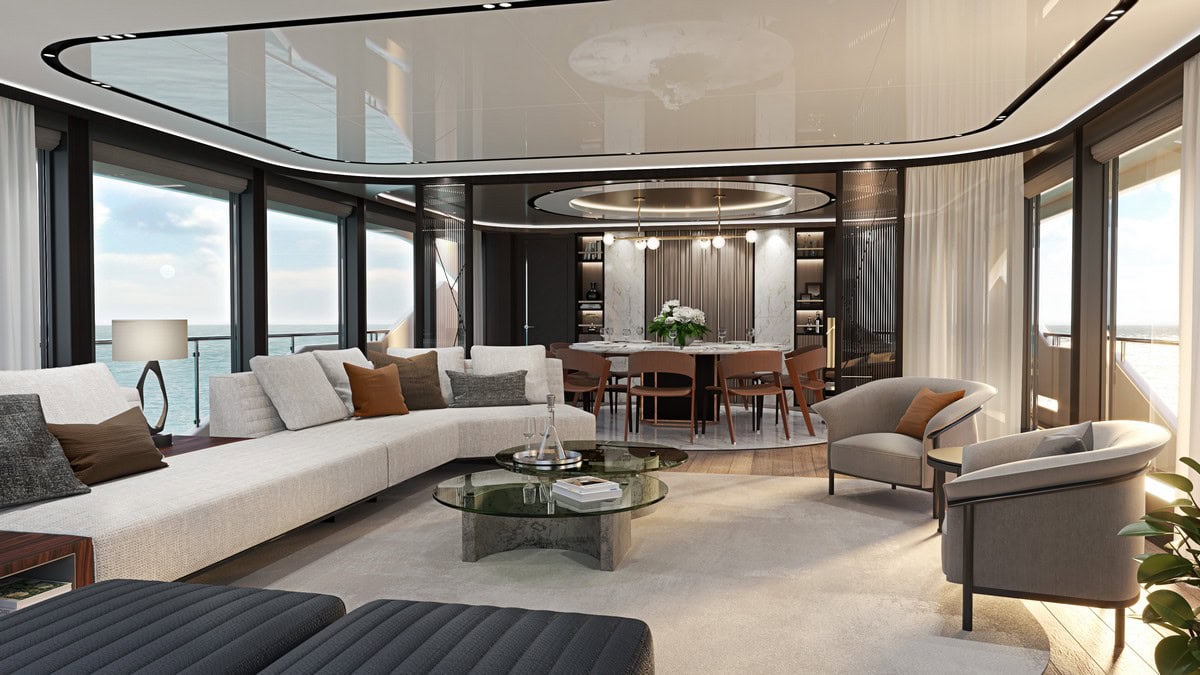 Internamente, il 120 Yacht si distingue per caratteristiche pensate per esaltare l’esperienza a bordo. Può ospitare dieci ospiti in quattro cabine ospiti, ognuna con bagno privato, oltre a una straordinaria suite armatoriale sul ponte principale. Gli interni sono stati concepiti in collaborazione con Design Unlimited, utilizzando materiali che massimizzano la luce naturale e creano un’atmosfera ricca e sofisticata. Vista ininterrotta dalla sala da pranzo al salotto nell’ampio open space del ponte principale. Le lussuose finiture in pietra, le dettagliate paratie centrali e gli elementi di illuminazione di spicco creano uno spazio elegante in cui l’armatore e i suoi ospiti possono immergersi.