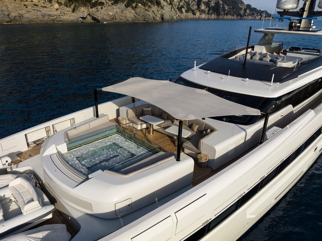 Kinda ha lo stesso profilo basso e aggraziato dei suoi predecessori, ma ha in più una piscina di 5.000 litri posizionata sul ponte di prua. Il design esterno di Paszkowski, l’elevata qualità costruttiva propria di Tankoa e la possibilità di installare una propulsione ibrida sono stati tutti fattori chiave nella scelta degli armatori di acquistare il progetto, la cui costruzione era stata iniziata on spec dal cantiere.