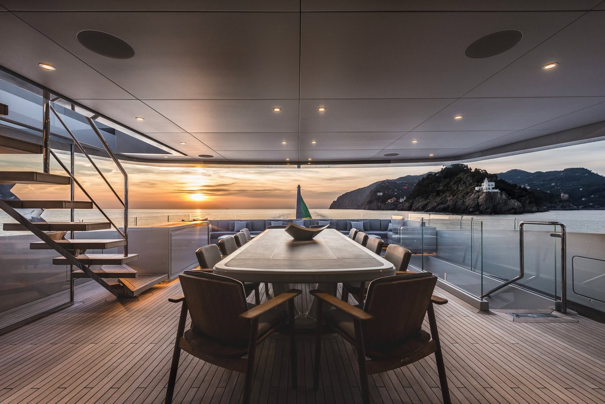 Le aree all’aperto includono un gran numero di divani sul ponte principale a poppa, la lounge e la piscina a prua, una sala da pranzo capace di servire tutti gli ospiti sul ponte superiore a poppa e l’ampio sundeck dotato di prendisole a prua, oltre a una cucina all’aperto, tavoli a scomparsa e lettini.