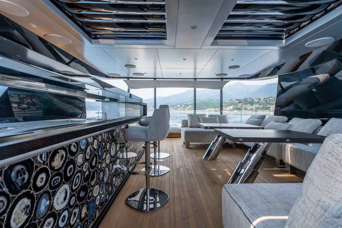 Il sundeck è progettato per gli amanti della vita al sole, dotato di lettini e di una seconda grande piscina, insieme a una zona ombreggiata sotto l’hardtop per pranzi all’aperto con tavoli a scomparsa. Vi è anche un’unità cucina-bar combinata realizzata in alluminio verniciato e teak nero, con una lastra di agata nera retroilluminata, la più grande mai installata su uno yacht.