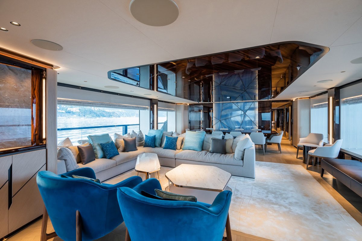 La raffinata artigianalità è evidente nelle pelli intrecciate tipo sella e nei soffitti personalizzati, nelle straordinarie stoffe di Armani, Rubelli, Dedar, Filippo Uecher e Mariaflora, e nei rivestimenti in pelle che si abbinano al sorprendente sistema audio migliorandone l’acustica. Il pacchetto si completa con sistemi di illuminazione personalizzati di alta gamma realizzati da Luce5 e un progetto di luci concepito per enfatizzare i contrasti e accentuare le palette dei colori interni. Infine, lo yacht ospita una collezione di opere d’arte appositamente selezionate.