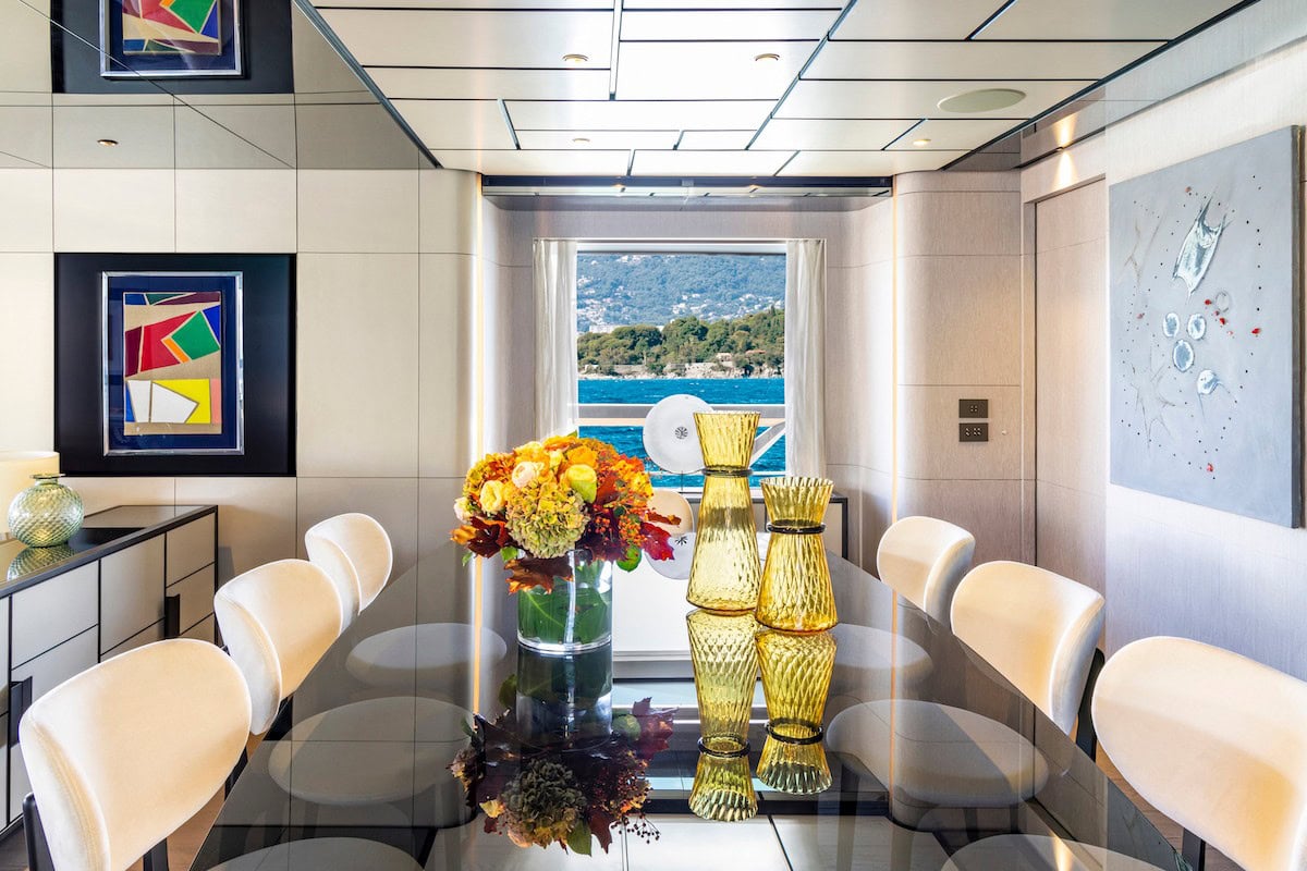 Arricchisce i living anche il vaso Coccio, contraddistinto da una fantasia di Murrine che ne esalta la forma, con un disegno grafico capace di valorizzare l’arte vetraria di Venini. Nella cabina armatore, i vasi Tiara di Francesco Lucchese regalano preziosi riflessi luminosi.