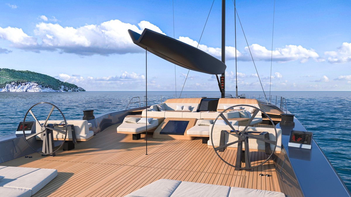 Le linee purissime abbracciano ampi spazi dedicati alla vita sociale e agli ospiti, cominciando dall’enorme pozzetto di 80 mq, il doppio di quelli presenti su imbarcazioni di questa lunghezza, che si sviluppa su un unico livello e si estende per tutto il baglio, sino all’alta e sicura impavesata che sostituisce la classica battagliola. Il layout è totalmente personalizzabile e offre posto a sedere per 15 persone. Gli unici elementi fissi sono le ruote gemelle in carbonio dei timoni e il tambuccio d’ingresso per l’equipaggio.