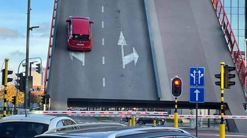 Il video dell’auto in Belgio bloccata su un ponte levatoio mentre si sollevava, per poi scivolare e ribaltarsi: passeggeri salvi per miracolo.