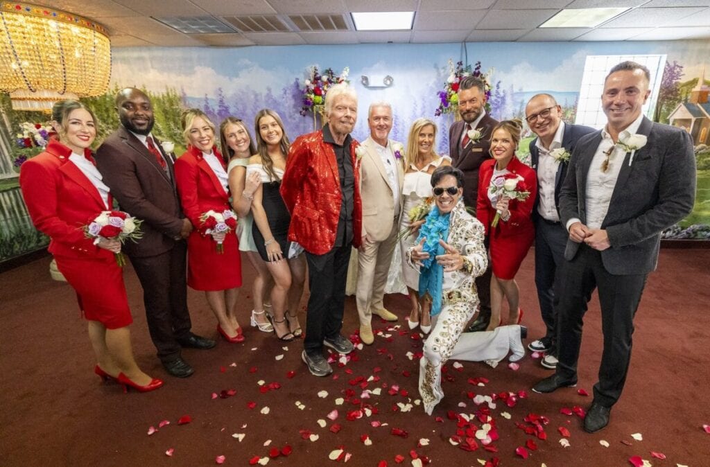 Sir Richard Branson irrompe a Las Vegas al matrimonio di due assistenti di volo che hanno lavorato per la sua compagnia aerea negli ultimi 40 anni
