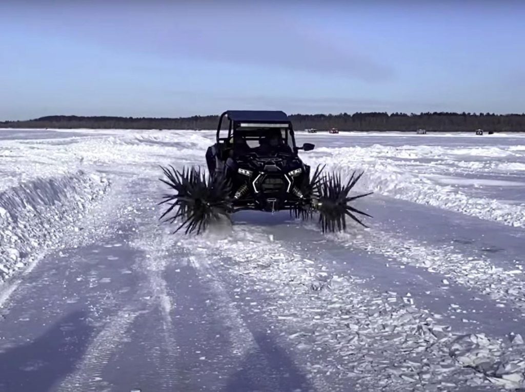 Dagli USA il video la trasformazione di un Polaris RZR che monta dei veri e propri ramponi e riesce ad superare strade e laghi ghiacciati.