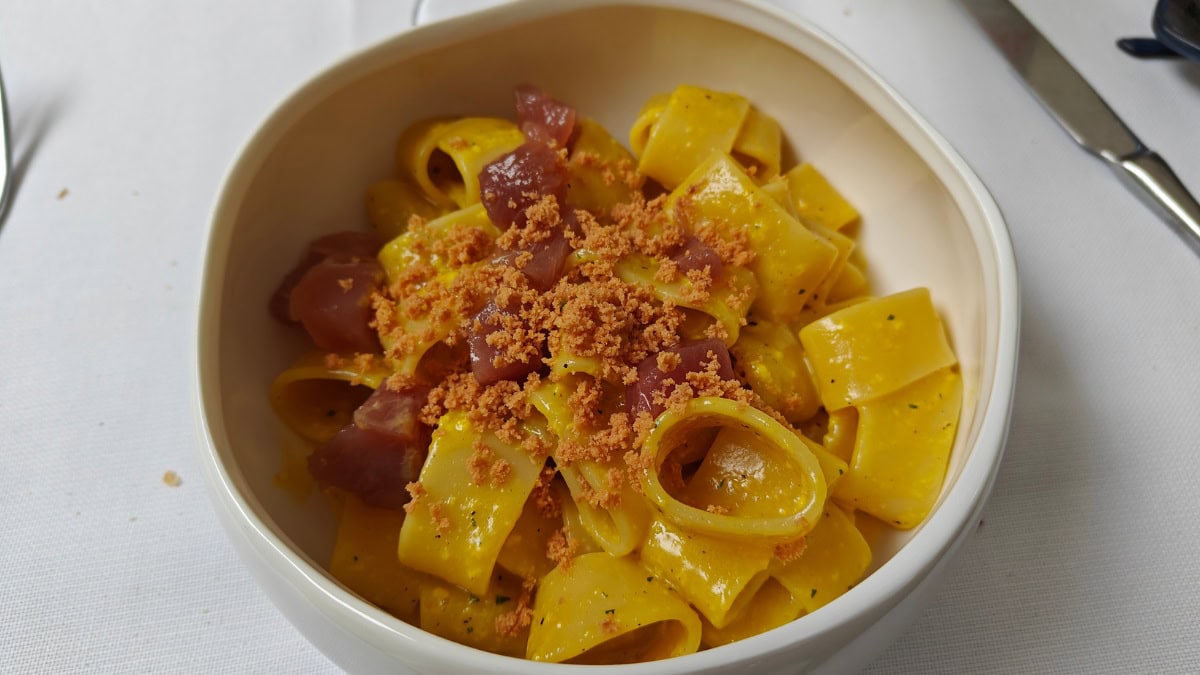 Ma essendo io un turista solo per finta, ho scelto un posto poco turistico. E infatti ho mangiato bene con questa carbonara di lago