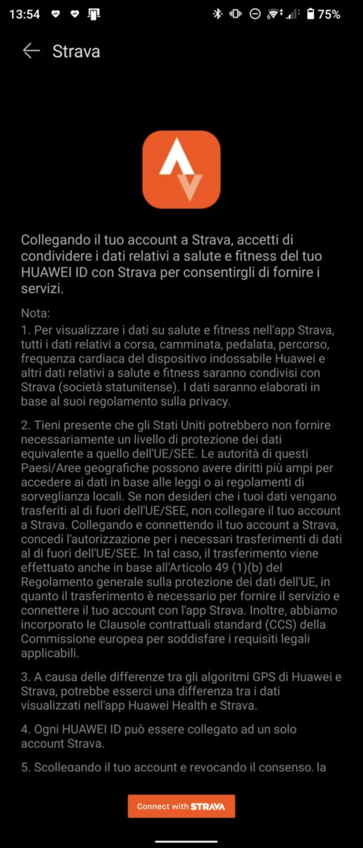 La prima versione di questa recensione è uscita 5 giorni prima della nuova compatibilità con Strava, l’app degli sportivi per eccellenza. La connessione è molto semplice: dall’app Huawei Health, che va aggiornata all’ultima versione, si va nella sezione “Scopri” e si clicka sul banner Strava dedicato. Da qui, una schermata porterà alla schermata di accesso di Strava, e dopo aver inserito i dati è possibile eseguire la connessione. La compatibilità tra Huawei Watch GT 3 Pro e l’applicazione è vincente, perché unisce i numerosi e precisi sensori dello smartwatch cinese all’app, permettendo una condivisione dei propri risultati più precisa ed efficace.