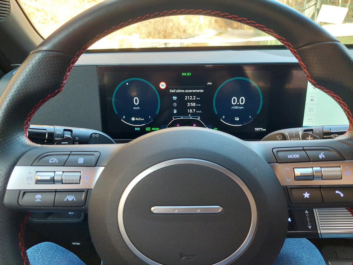 Ho usato la Hyundai Kona full hybrid nella mia vita quotidiana di due settimane: quindi, il classico casa-lavoro, una commissione di lavoro da Piacenza a Parma, qualche viaggio tra la mia casa sui colli piacentini e Milano e una gita fuori porta in Valsassina, in provincia di Lecco, durante le Feste natalizie. Un totale di 500 km, durante i quali ho apprezzato le doti di stradista della Kona. Caratteristiche che la differenzia rispetto alla sorella elettrica.