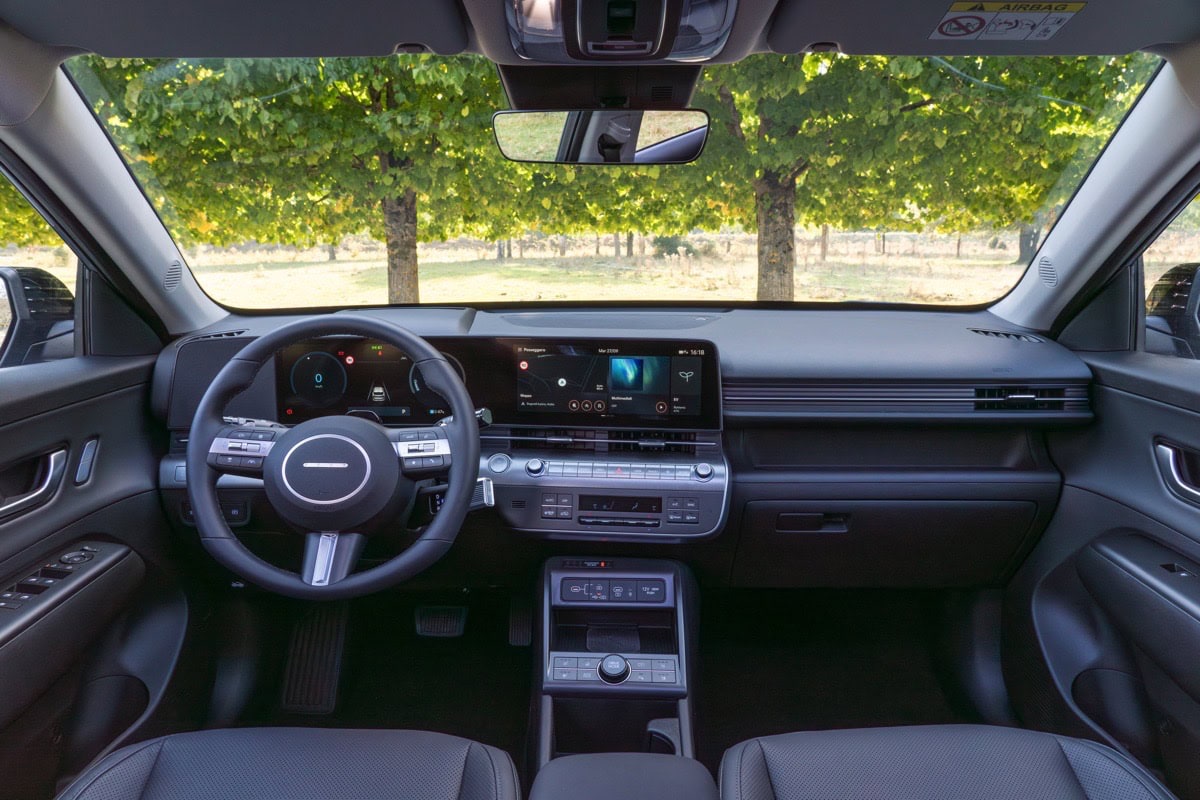 Il comando del cambio shift-by-wire posizionato dietro al volante libera spazio nella console centrale, creando un ambiente pulito e aperto che può essere utilizzato per riporre oggetti, inclusi borse di grandi dimensioni. Sulla scia di quanto visto sulle Ioniq, la plancia è dotata di due schermi da 12,3 pollici ciascuno, progettati per un utilizzo ergonomico e confortevole.