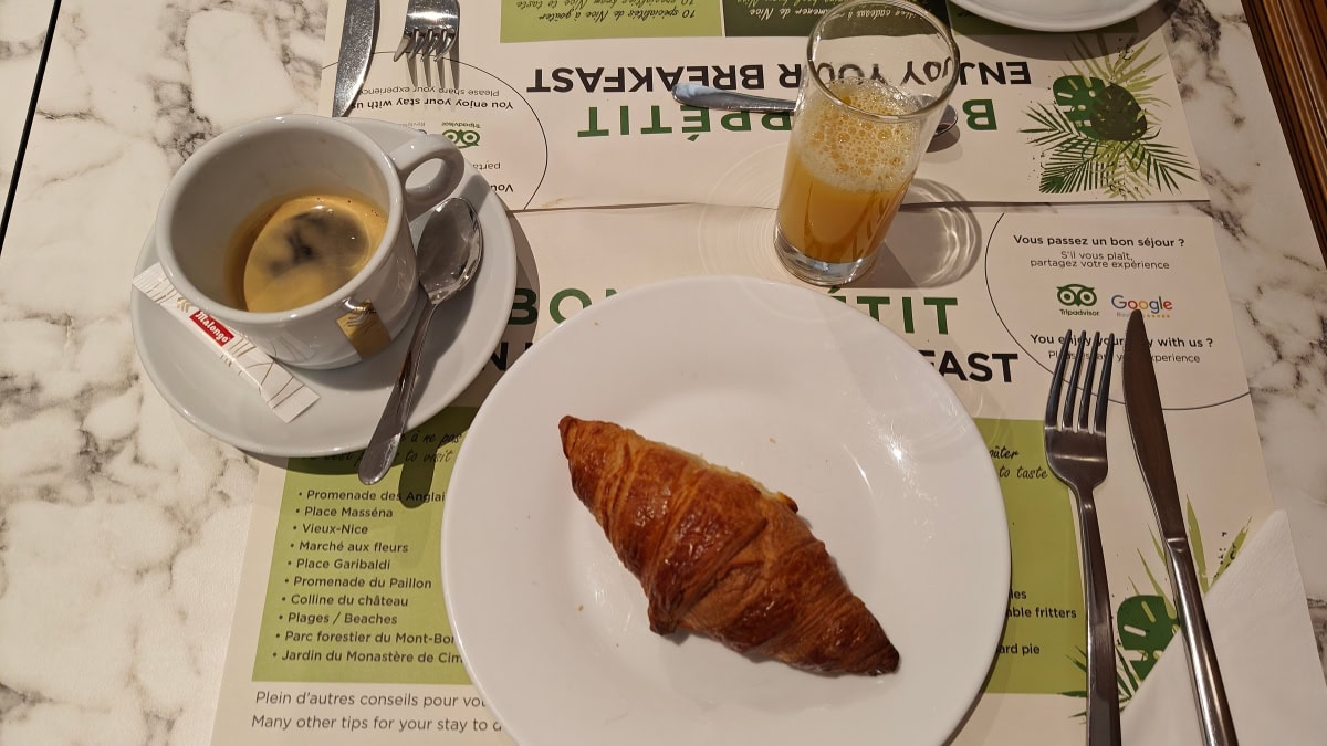 Mi sono rifatto con la colazione: un buonissimo croissant, un caffè accettabile e spremuta