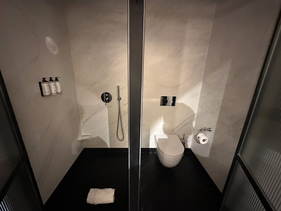…da una parte la doccia, dall’altra il gabinetto, a loro volta separati dal resto