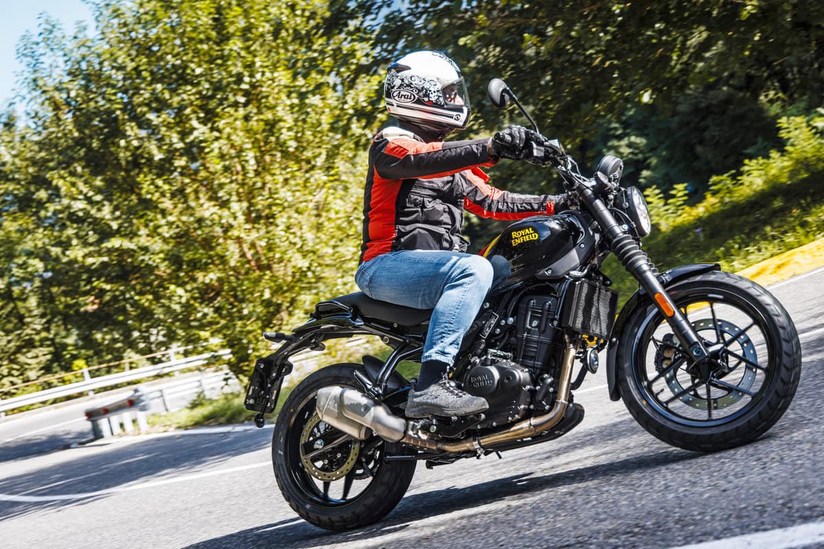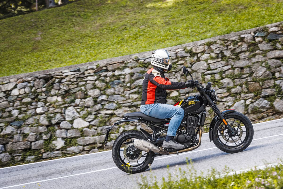 Dico subito che la Guerrilla 450 eccelle per maneggevolezza e agilità. Grazie all’aggiornamento del telaio, che deriva dalla piattaforma dell’Himalayan 450 ma con modifiche sostanziali, la moto si comporta molto bene nei tratti misti e nelle curve. L’angolo di sterzo è stato ridotto a 21,8°, mentre l’interasse è sceso a 1.440 mm, contribuendo a rendere la moto più reattiva rispetto alla sorella maggiore Himalayan. Le sospensioni, con una forcella Showa anteriore non regolabile e un ammortizzatore posteriore a cantilever, assorbono bene le asperità del terreno, anche se su tratti più accidentati potrebbero risultare un po’ morbide per una guida sportiva.