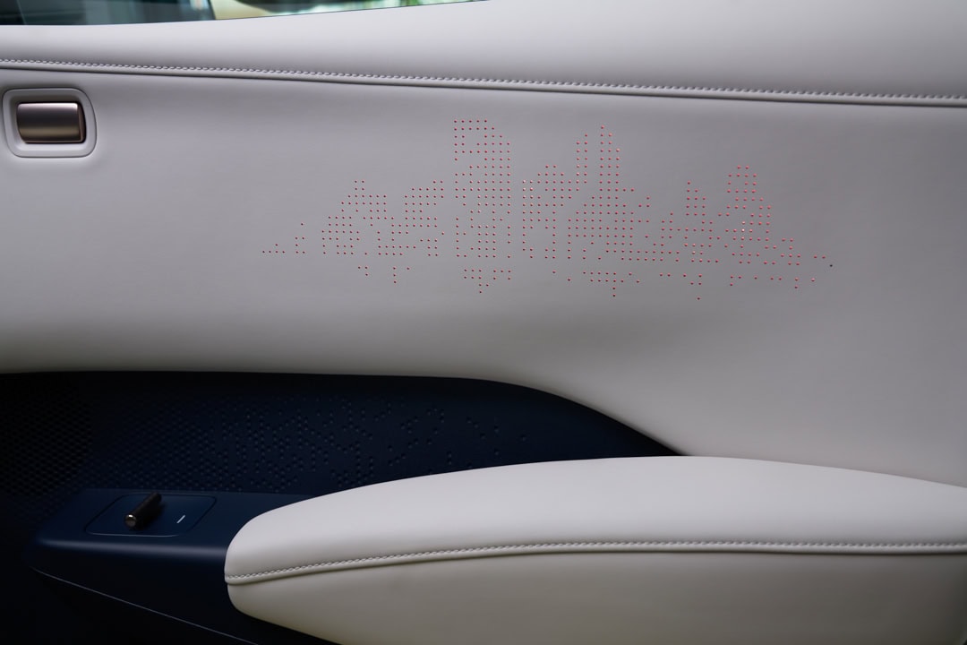 E poi, l’elemento rosegold che impreziosisce tutto, con finiture intorno ai poggiatesta, come bottoni e appendiabiti, e come cromature nella parte posteriore. Sui pannelli porta, le impunture richiamano uno skyline di grattacieli che si illumina insieme al resto delle luci ambiente e delle casse dell’impianto audio Yamaha.
