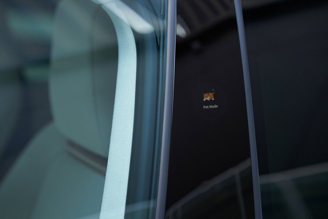 Oppure il mini display sul montante centrale, che mostra lo stato della carica, avvisa che il connettore è stato tolto, oppure mostra alcune funzionalità, come la modalità non disturbare o la Pet Mode. Quest’ultima crea l’ambiente ideale per cani e gatti quando vengono lasciati in auto mentre il proprietario fa le sue commissioni, e avvisa esternamente che l’animale non è stato dimenticato.