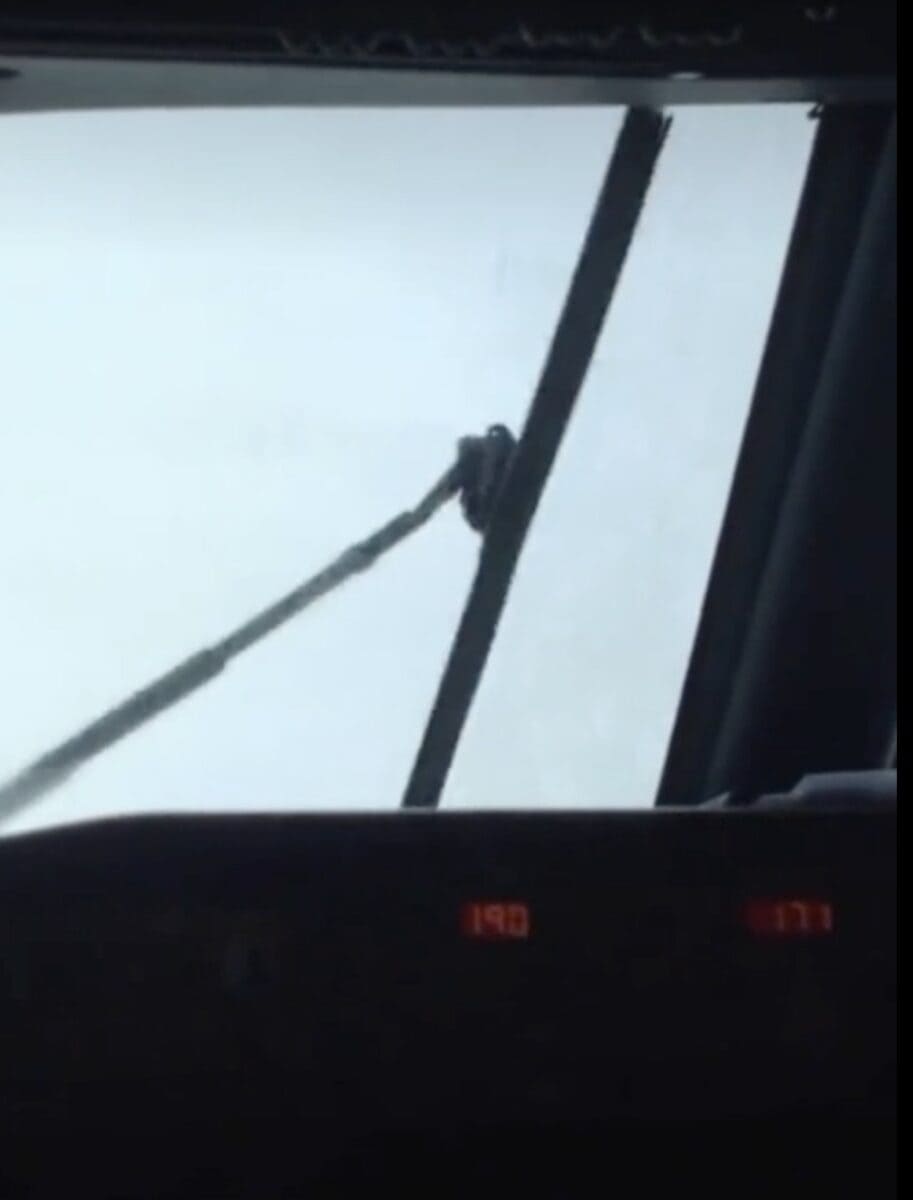 Poco dopo questa segnalazione però, la pioggia aumenta. Non la vediamo arrivare da sinistra o da destra. Aumenta semplicemente fino al punto in cui i tergicristalli non riescono più a pulire il vetro. Si tratta di uno sfortunato effetto collaterale del design del finestrino del Boeing: la pioggia non vi scorre sopra senza problemi, ma vi sbatte contro. Se si guardasse fuori dal finestrino laterale destro o sinistro, la visibilità sarebbe ancora buona. Ma naturalmente non si può atterrare guardando dal finestrino laterale.
