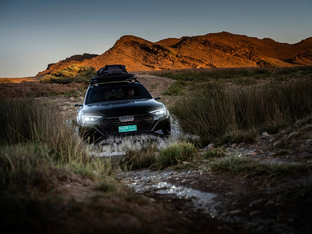 Rispetto al modello Q8 55 e-tron quattro, l’edition Dakar presenta pneumatici all-terrain General Grabber AT3 e un assetto rialzato di 65 mm, portando la profondità di guado a 300 mm. Inoltre, il programma “lift” dell’Audi drive select permette di rialzare ulteriormente l’assetto di 17 mm, migliorando l’angolo d’attacco, di dosso e di uscita.