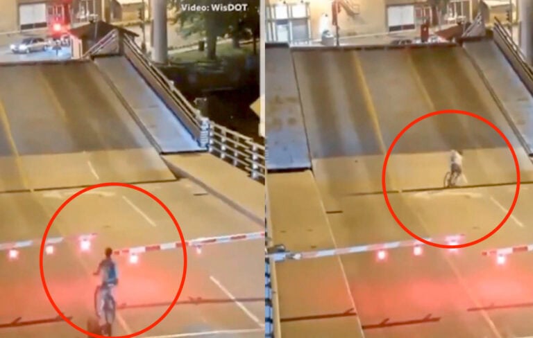 Le immagini delle telecamere di sorveglianza del Dipartimento dei Trasporti del Wisconsin, negli USA, mostrano la ciclista che supera le barriere del ponte Racine Street. Le barriere erano state abbassate per impedire il passaggio e segnalare l’apertura del ponte. La donna di 37 anni stava pedalando in bicicletta attorno alle 22, secondo quanto riportato dalla CBS.