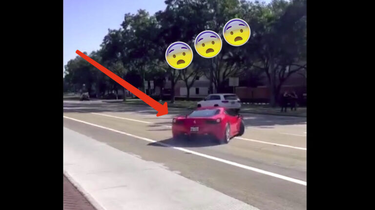 Da quello che possiamo vedere sembra proprio che la ragazza non abbia mai azionato i freni, nonostante la bassa velocità con quale la Ferrari 458 Italia si avvicina al muretto. Un brusco e deciso uso del freno sarebbe stato probabilmente sufficiente a salvare la vettura da gravi danni. Invece, quando l’auto entra in contatto con il muro, è facile vedere gli airbag dispiegarsi. Il conducente esce assolutamente indenne e viene visto al telefono.