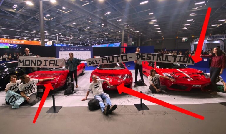 Una decina attivisti di Extinction Rebellion hanno preso d’assalto il Salone dell’Auto di Parigi ieri sera e si sono incollati alle supercar, tra cui una Ferrari da 200.000 euro. Gli esponenti di Extinction Rebellion hanno issato uno striscione e cantato mentre alcuni degli “eco-guerrieri” si sono seduti per terra e hanno incollato le mani ai cofani delle auto, versando vernice nera. Lo striscione era tenuto sopra tre auto sportive rosse ricoperte di vernice nera.
