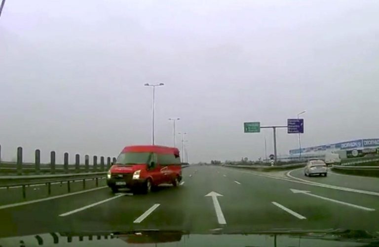 Sulla Autostrada A3 in Romania un furgone rosso è entrato in contromano dall’uscita dell’autostrada, e anziché accorgersi dell’errore ha proseguito la sua folle corsa in contromano.