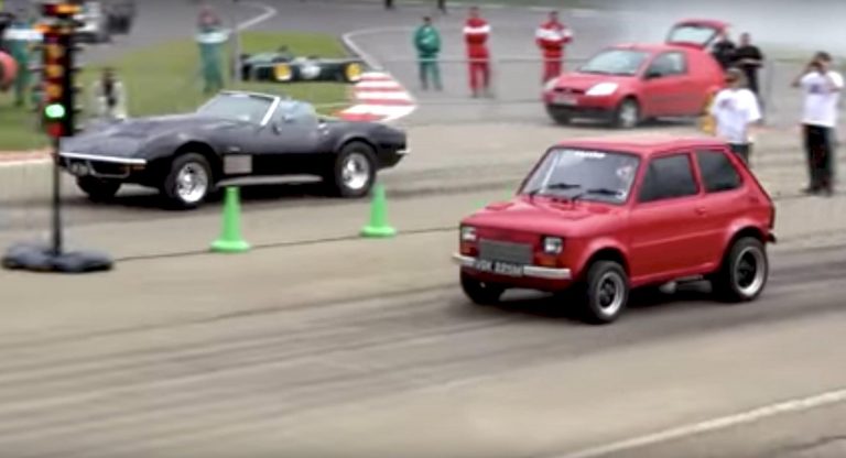 Alzate il volume al massimo, perchè in questa drag race inglese una Fiat 126 rossa riesce a battere una Corvette. Il “trucco” c’è, ed è il motore Chevy V8 montato al posto di quello originale Fiat.