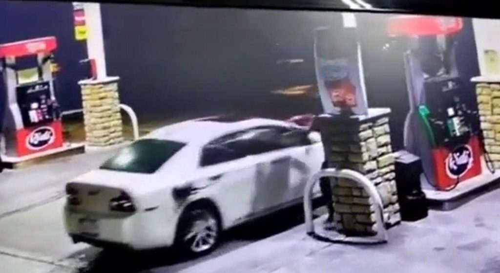 Negli Stati Uniti un frontale secco al benzinaio toglie letteralmente la pompa dalla mano del povero sventurato automobilista.