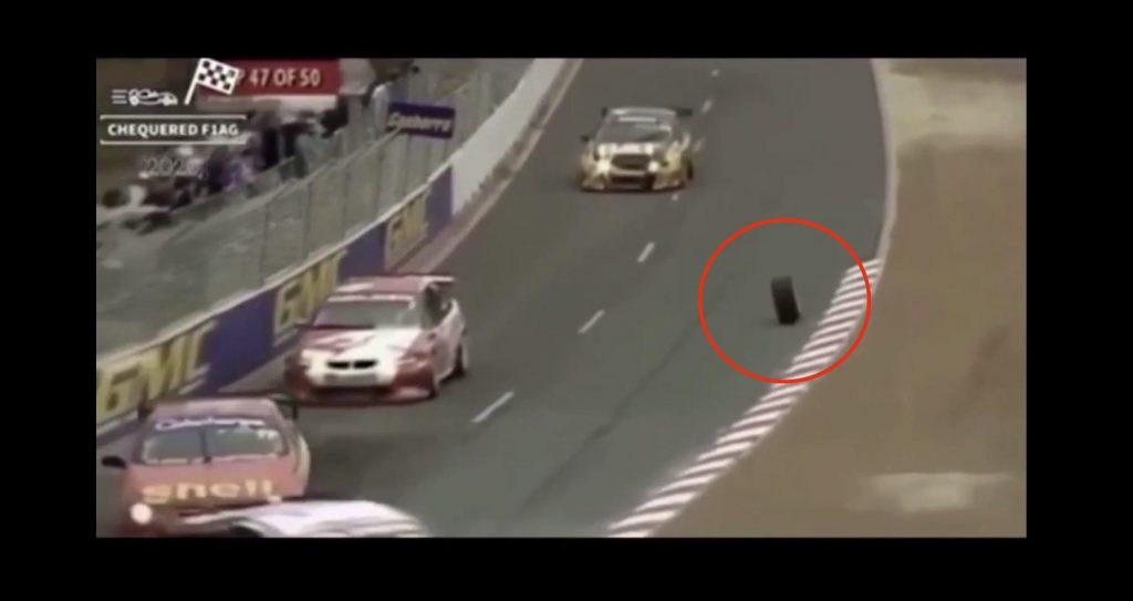 In una gara automobilistica può capitare che uno pneumatico incominci a viaggiare incontrollato sulla pista. Difficilmente capita un finale come nel video che proponiamo oggi.
