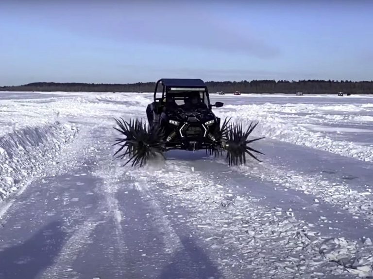 L’idea è semplice: cosa c’è di meglio di un rampone per rimanere letteralmente ancorati sul ghiaccio? Ecco allora quattro ruote che in realtà sono un’ammasso di spuntoni, montate su un bel Polaris RZR.