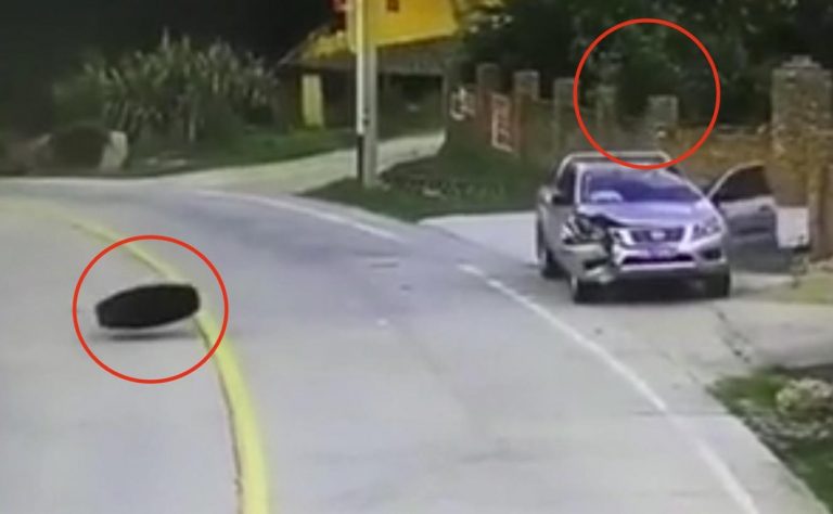 In questo video il povero automobilista viene centrato non da uno ma da ben due cerchioni che si sono staccati da un camion. Se non è sfortuna questa.