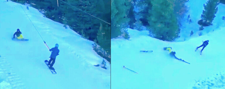 Per una volta un incidente tutto da ridere che ha come protagonista uno snowboarder maldestro e la decina di sciatori che sono carambolati a terra. Non sappiamo se lo snowboader ha completamente sbagliato la presa dell’ “ancora” dello ski lift, oppure se nessuno gli aveva spiegato bene il funzionamento.