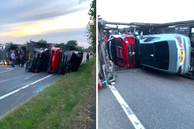 Video condivisi online e diventati in breve tempo virali, hanno catturato la scena successiva all’incidente. Diverse vetture di lusso, giacevano completamente ribaltate vicino accanto alla bisarca riversa su un lato.