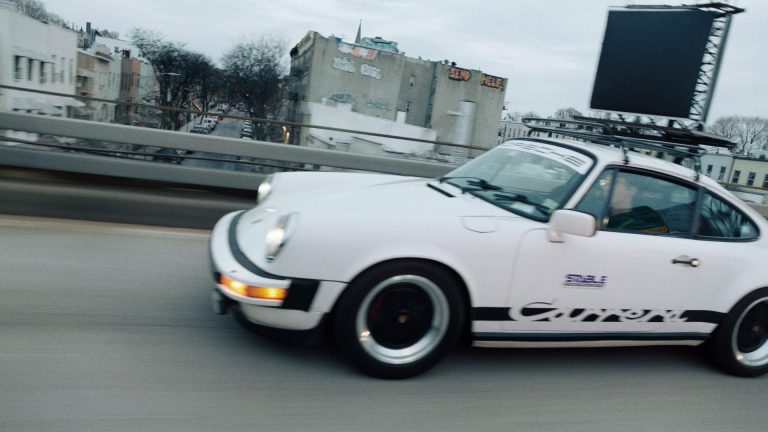 Richard Phillips lascia il suo studio artistico indossando il Gommino in pelle scamosciato blu scuro per un giro veloce sulla sua Porsche d’epoca.