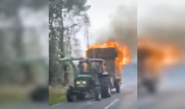 Sembra quasi un mezzo militare impegnato in un combattimento, ma è “solo” un trattore in fiamme. Da notare i tizzoni ardenti che si lascia dietro… un vero e proprio pericolo pubblico.