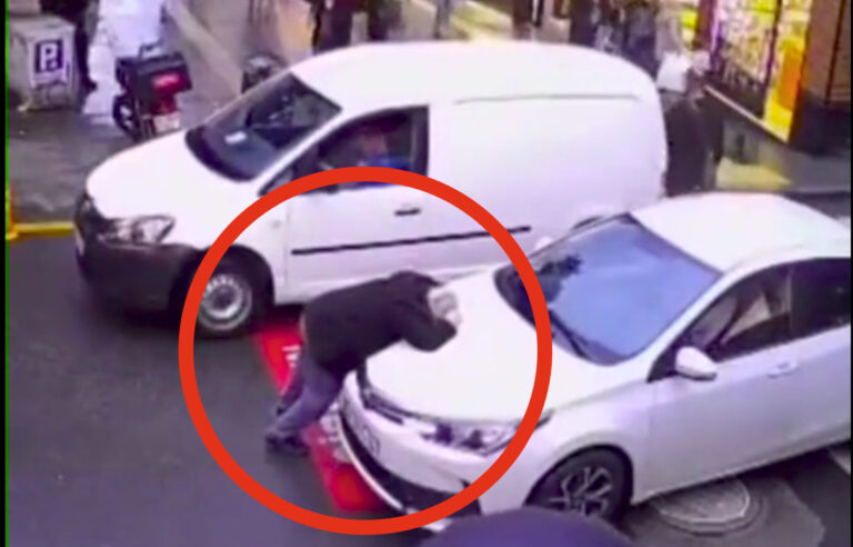 Ma andiamo con ordine, come possiamo vedere nel video, siamo su una strada trafficata dove le auto si muovono molto lentamente. Un uomo attraversa la strada lanciando un’occhiata all’auto bianca che sta passando. Quando l’auto ha già quasi superato il pedone, ed ecco che l’uomo si appoggia con l’avambraccio sinistro al cofano. L’automobile ovviamente si ferma, e qui incomincia una performance da Oscar.