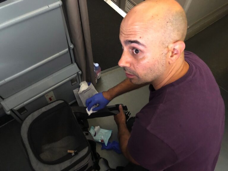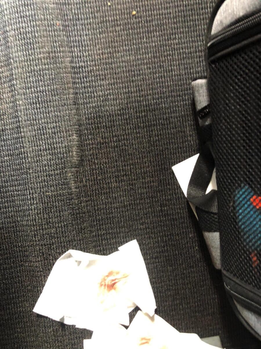 Ha poi raccontato di aver preso lo zaino da sotto il sedile e ha notato che anche la tracolla era intrisa di sangue. E’ stato costretto a mettersi in ginocchio a pulire da solo per mezz’ora, con l’equipaggio che gli ha dato guanti e ulteriori fazzoletti per pulire il pavimento, senza che nessuno lo aiutasse.
