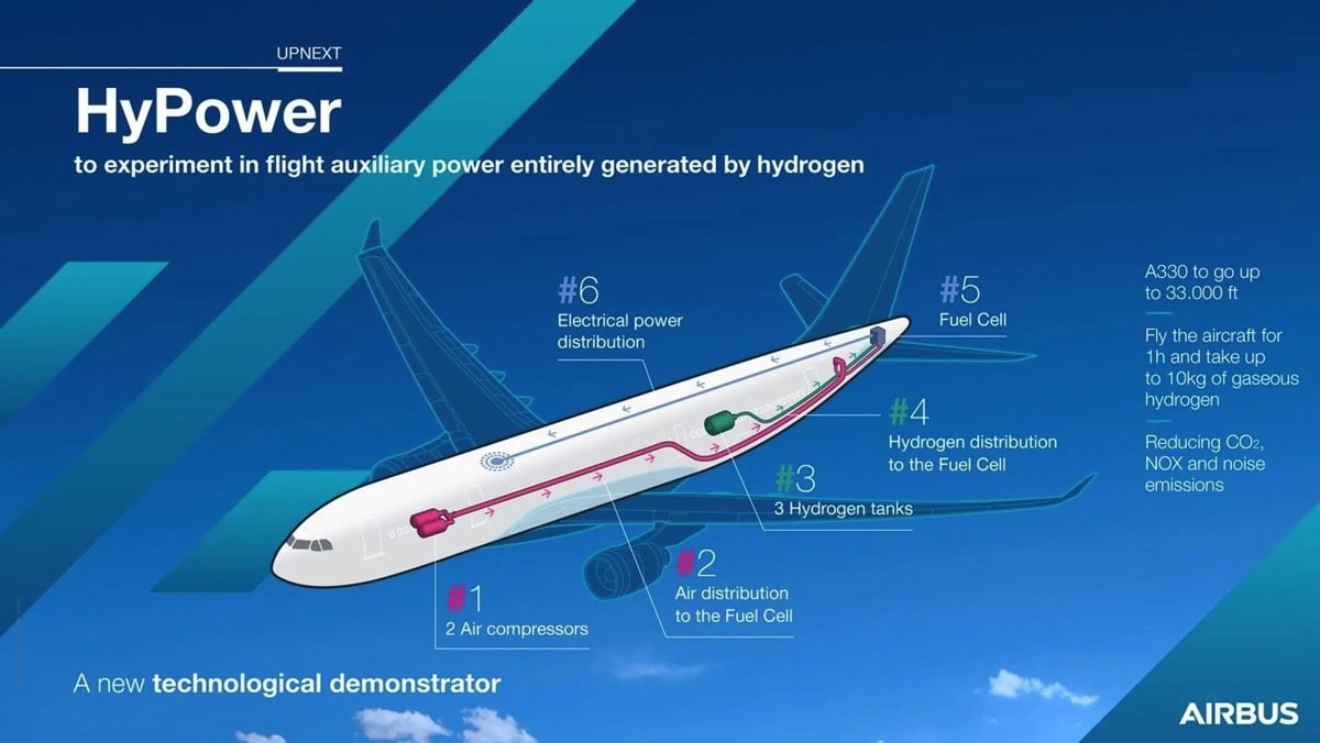 Entro il 2025, Airbus intende realizzare un dimostratore tecnologico chiamato HyPower, che sostituirà l’APU di un Airbus A330 con una cella a combustibile a idrogeno. Questo sistema ridurrà le emissioni e i livelli di rumore rispetto a un’unità convenzionale.