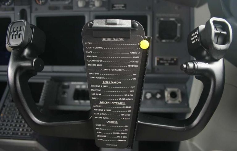 Nella parte centrale, e mi riferisco sempre alla cloche in uso sui velivoli Boeing 737, troviamo una piccola check list ed un cursore mobile. Questa check list funge da reminder per i controlli da effettuare nelle varie fasi del volo, mentre il cursore mobile serve come segna libro, per ricordarci fino a che punto abbiamo già condotto la lettura di queste procedure.