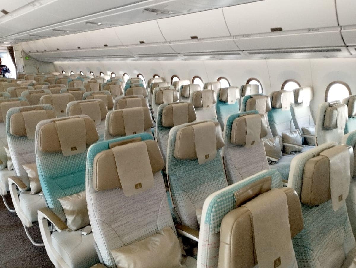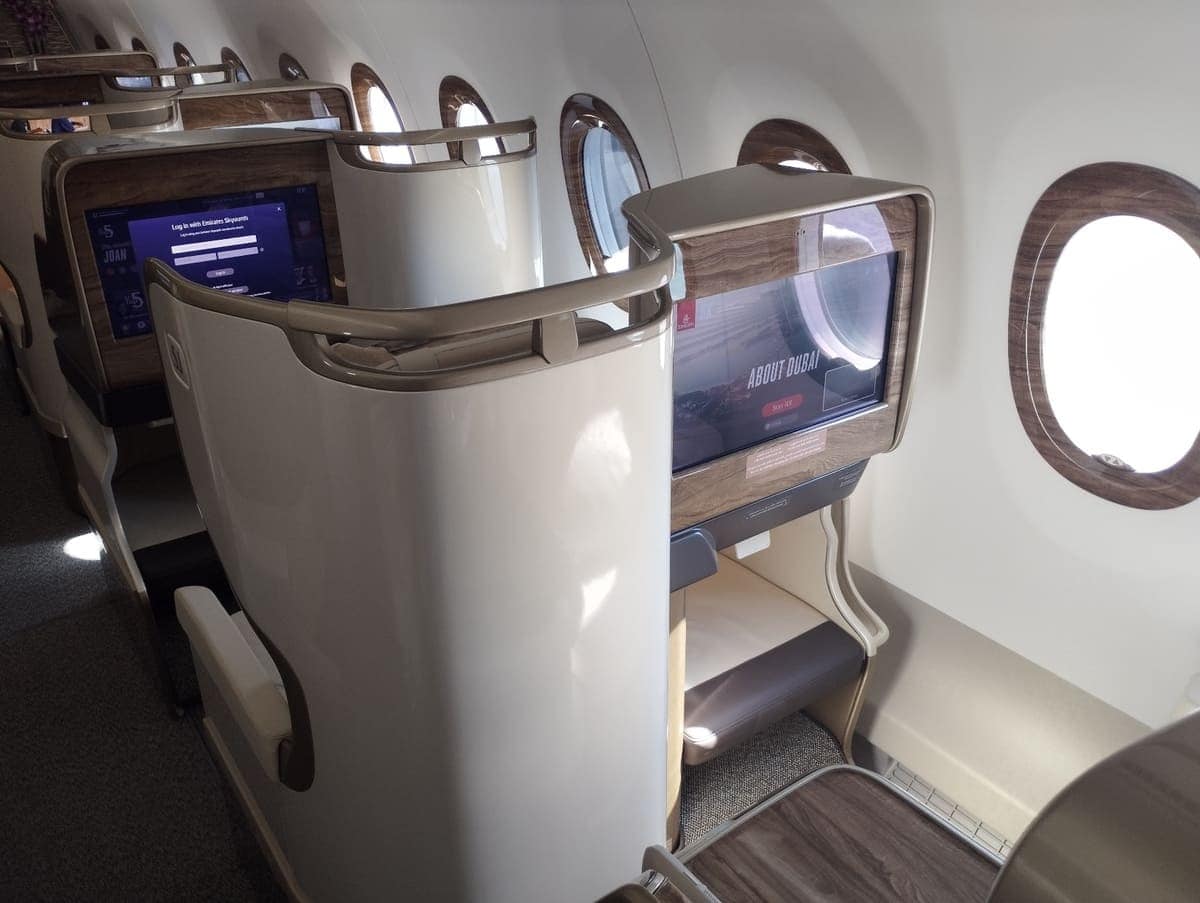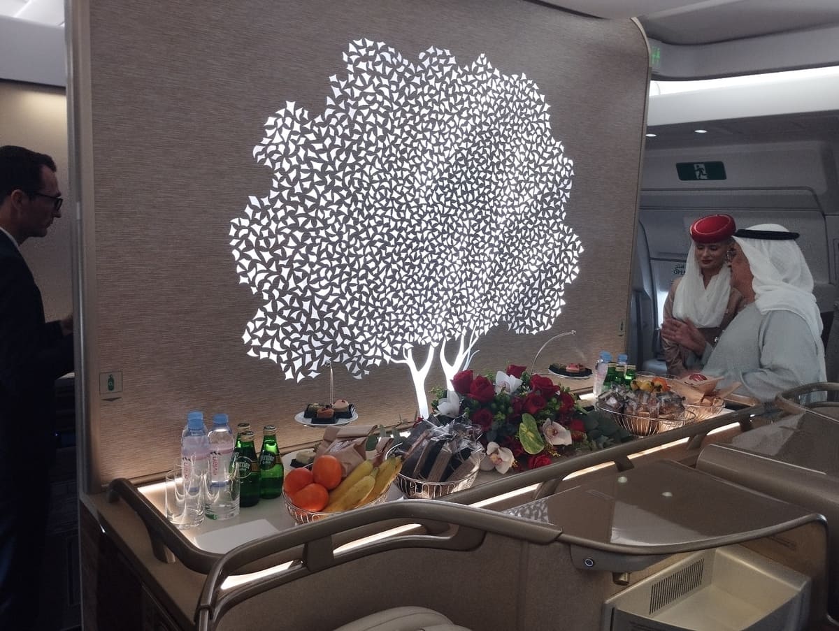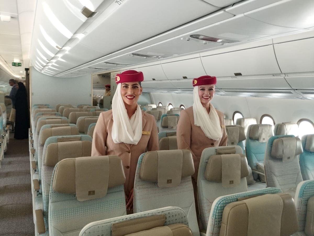 Gli interni dell’Airbus A350 riflettono l’impegno di Emirates nel fornire un ambiente elegante e confortevole. Il design trae ispirazione dall’albero Ghaf, simbolo nazionale degli Emirati Arabi Uniti, combinando materiali pregiati con colori caldi e naturali, come bronzo, oro e legno chiaro. Ogni elemento è stato studiato per creare un’atmosfera rilassante ed accogliente, che accompagna il passeggero durante tutto il viaggio.