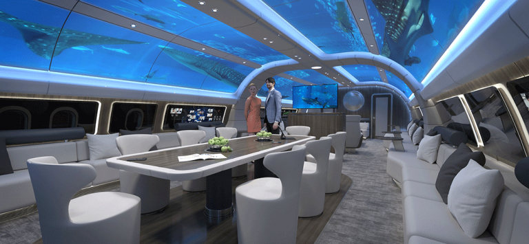 Una rivoluzione nel concetto di arredo, che diventa dinamico, rimanendo sempre di lusso, pronto ad adattarsi ai gusti e alle attività che si svolgono all’interno del velivolo, con effetti speciali che saranno in grado di sorprendere piacevolmente i passeggeri, facendo quasi dimenticare i tempi di viaggio necessari per arrivare a destinazione.