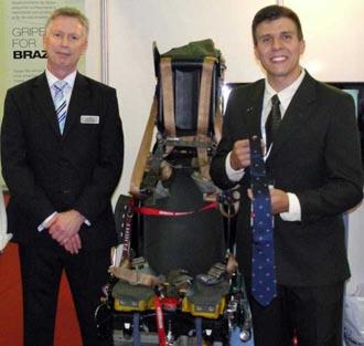 Per la cravatta invece, si apre un altro discorso. Ogni volta che un pilota abbandona il proprio incontrollabile aereo e porta la pelle a casa, pieno di gratitudine verso gli ingegneri della Martin Baker, viene automaticamente iscritto ad honorem nel Ejection Tie Club, che raccoglie tutti quei piloti che hanno la fortuna di poter raccontare la propria, più o meno, drammatica vicenda. Come nel caso della foto qui sotto, scattata per l’arrivo della cravatta di Marcelino Correia, vittima di un incidente nel Febbraio 2011, ma fortunatamente salvato dal seggiolino eiettabile.