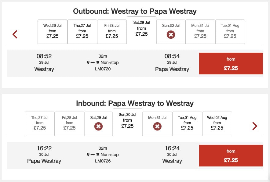 Se ne occupa la linea aerea Loganair che in pratica effettua questa tratta dal 1967. La peculiarità di questo volo sta proprio nella brevissima distanza, 2,7 km, che viene generalmente coperta in poco più di un minuto o due. Il record di brevità, se così possiamo dire, è stato di 53 secondi, che potrebbe scendere a soli 47 secondi con venti favorevoli.
