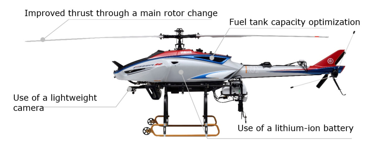 La capacità di gestire carichi più pesanti può essere attribuita a un aumento della potenza grazie al potenziamento del diametro e della forma della pala del rotore principale. Inoltre, Yamaha Fazer R G2 è più leggero, utilizza una batteria agli ioni di litio e ha ottimizzato la capacità del serbatoio del carburante.